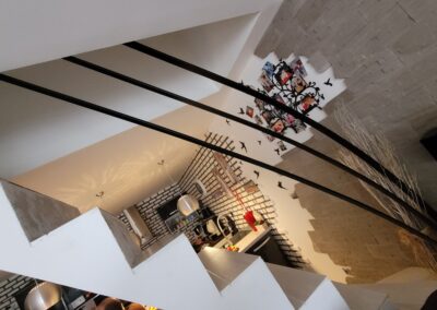 L’escalier est aussi un symbole de transition et de progression, reliant deux espaces et facilitant le passage. Il peut être orné de détails raffinés comme des balustrades travaillées, des contremarches décorées ou des mains courantes élégantes. La lumière joue également un rôle crucial, mettant en valeur les textures et les formes, créant des ombres et des jeux de lumière qui dynamisent l’espace.